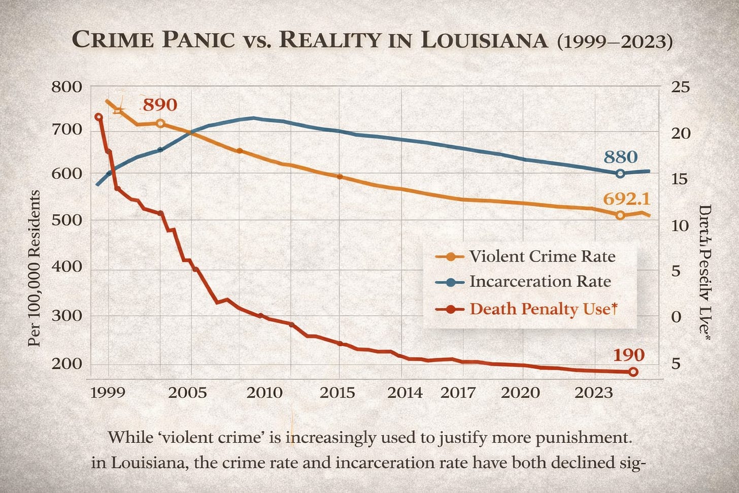 Sadly, I have to report that Louisiana has, in the past two years, turned a corner on this journey. Jeff Landry, Louisiana’s governor, reinstituted an energized push toward carrying out the sentences of men who have lived many, many years on death row while rebuilding their lives and becoming the people they were truly meant to be. Landry convinced a handful of MAGA legislators that his way was the only way to solve the crime crisis. Not surprisingly, the crime rate throughout Louisiana has consistently gone down for years, with the exception of the nationwide spike during the COVID pandemic era, which was unpredictable.
