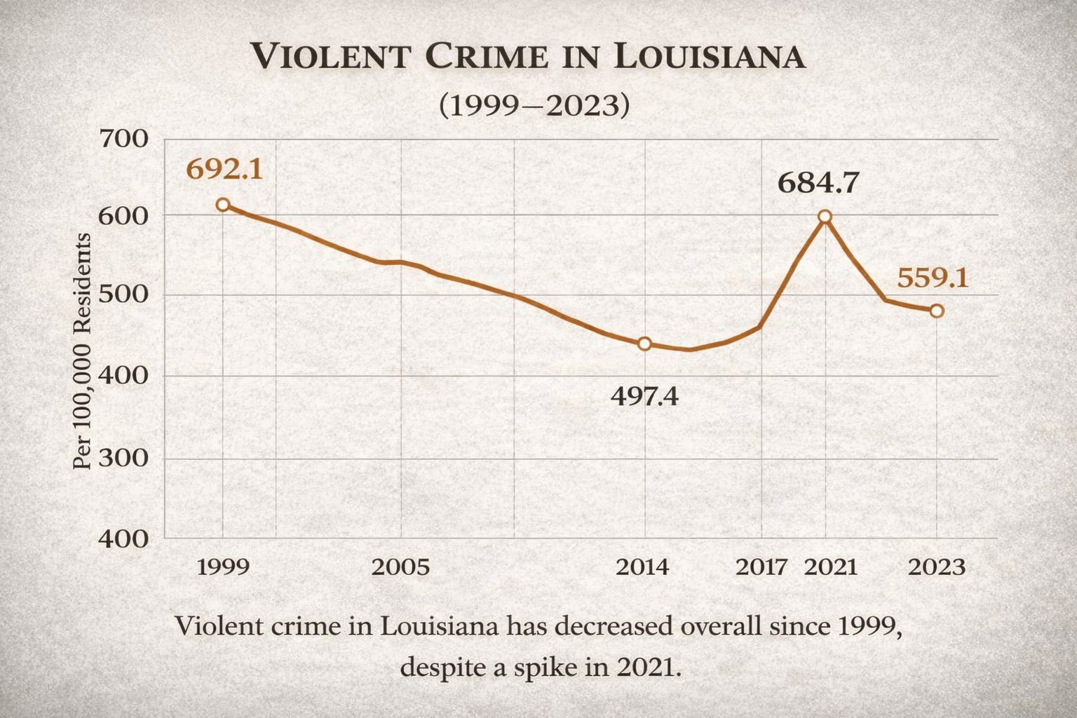 Louisiana’s violent crime rate today is still well below the levels recorded in the late 1990s and early 2000s. While crime spiked nationally during the pandemic years of 2020–2021, the long-term trend over the past quarter-century is downward.